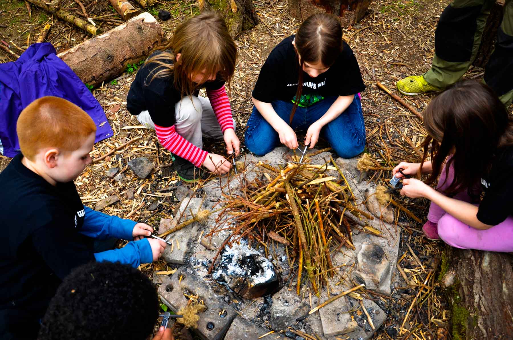 Die Kinder lernen grundlegende Techniken für das Leben in der Natur kennen (Zelt aufbauen, Feuer machen, Erste Hilfe, Orientierung mit dem Kompass, Bau einer Seilbrücke). Jedes Kind stellt sein eigenes